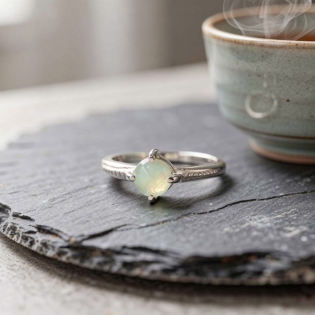 サイドに小さなドット模様をそっとあしらい、 一粒の天然石が静かに引き立つシンプルなデザインに仕立てました。 プレーナイトは、マスカットの果汁を思わせるような、淡く爽やかなグリーン。 6mmの格子柄カットが施されたカボションは、光をふんわりと受け止め、 柔らかな透明感を指先に添えてくれます。 優しい色合いは、普段の装いにもお出かけのコーディネートにも自然に馴染み、 大人の方にも合わせやすい落ち着いた雰囲気です。 こちらは 掲載写真の作品そのものをお届けする“一点もの” です。 石の表情や銀の質感は、世界にひとつだけのもの。 気に入っていただけましたら、ぜひこの機会にお迎えください。 【掲載作品の詳細】 ・素材:Silver925 ・石:プレーナイト(6mm・格子柄カボション) ・リングサイズ:13号 ※写真のリングをそのままお届けします。 【発送について】 一点物のため、丁寧に検品・梱包を行い、 ご注文から5〜7日ほどで発送いたします。 お早めの到着日のご希望がございましたら、 お気軽にお知らせください。 【別サイズをご希望の方へ】 こちらのデザインは、サイズ違いをご希望の場合、 受注制作にて10〜15号(0.5号刻み)でお作りすることもできます。 制作には約3〜4週間ほどお時間をいただきますが、 「早めに欲しい」などのご相談も承っております。 どうぞお気軽にお声がけください。 【天然石について】 天然石には、細かな傷・インクルージョン(内包物)・クラックが見られる場合があります。 これは自然の中で長い年月をかけて育まれた証であり、石の個性としてお楽しみいただければ幸いです。 【ご案内】 ・複数ショップで販売しているため、ご注文後に在庫切れとなる場合がございます。 ・地金相場の変動により、価格を改定させていただく場合がございます。 ・日時指定をご希望の場合は、備考欄にてお知らせください。