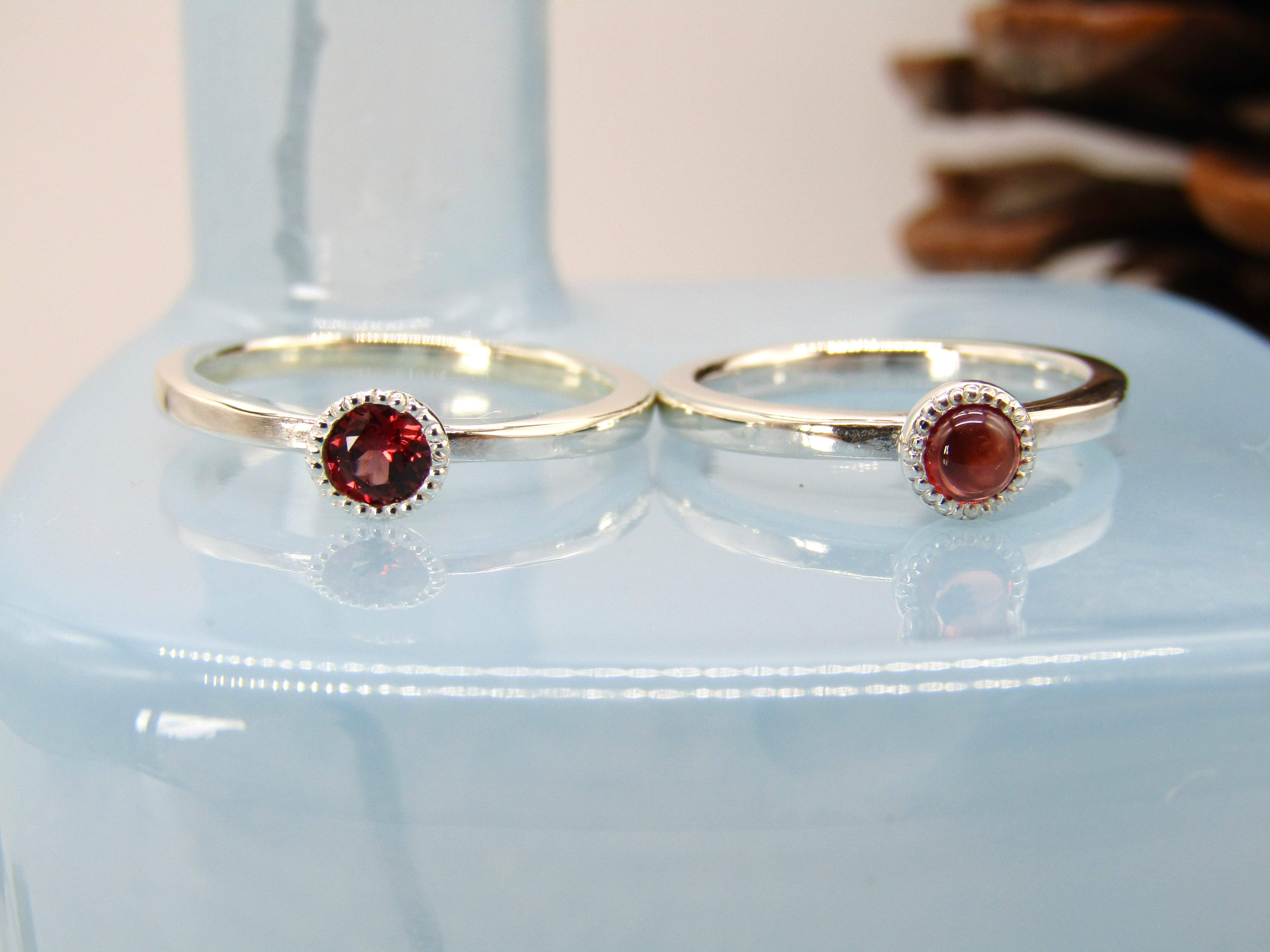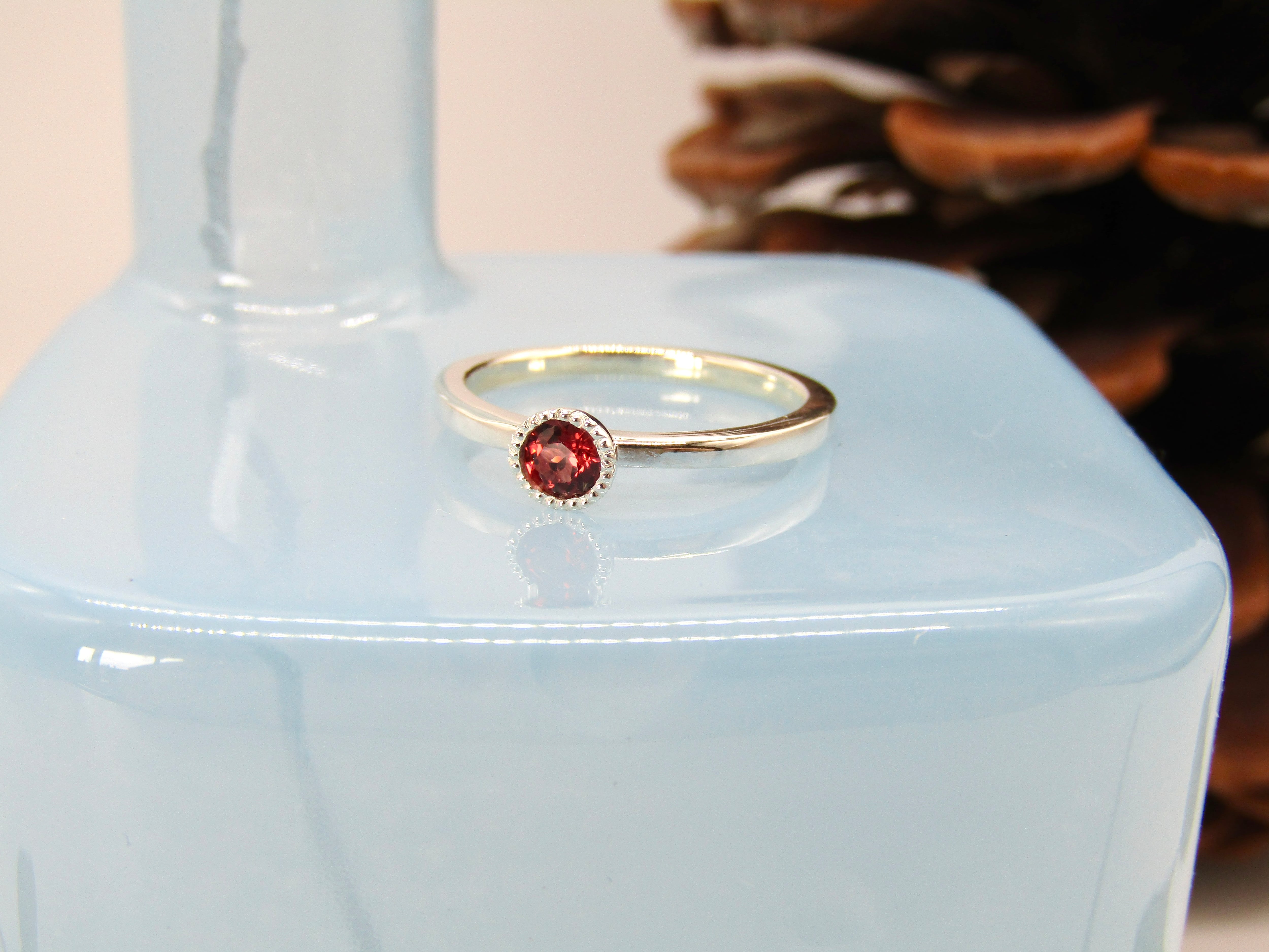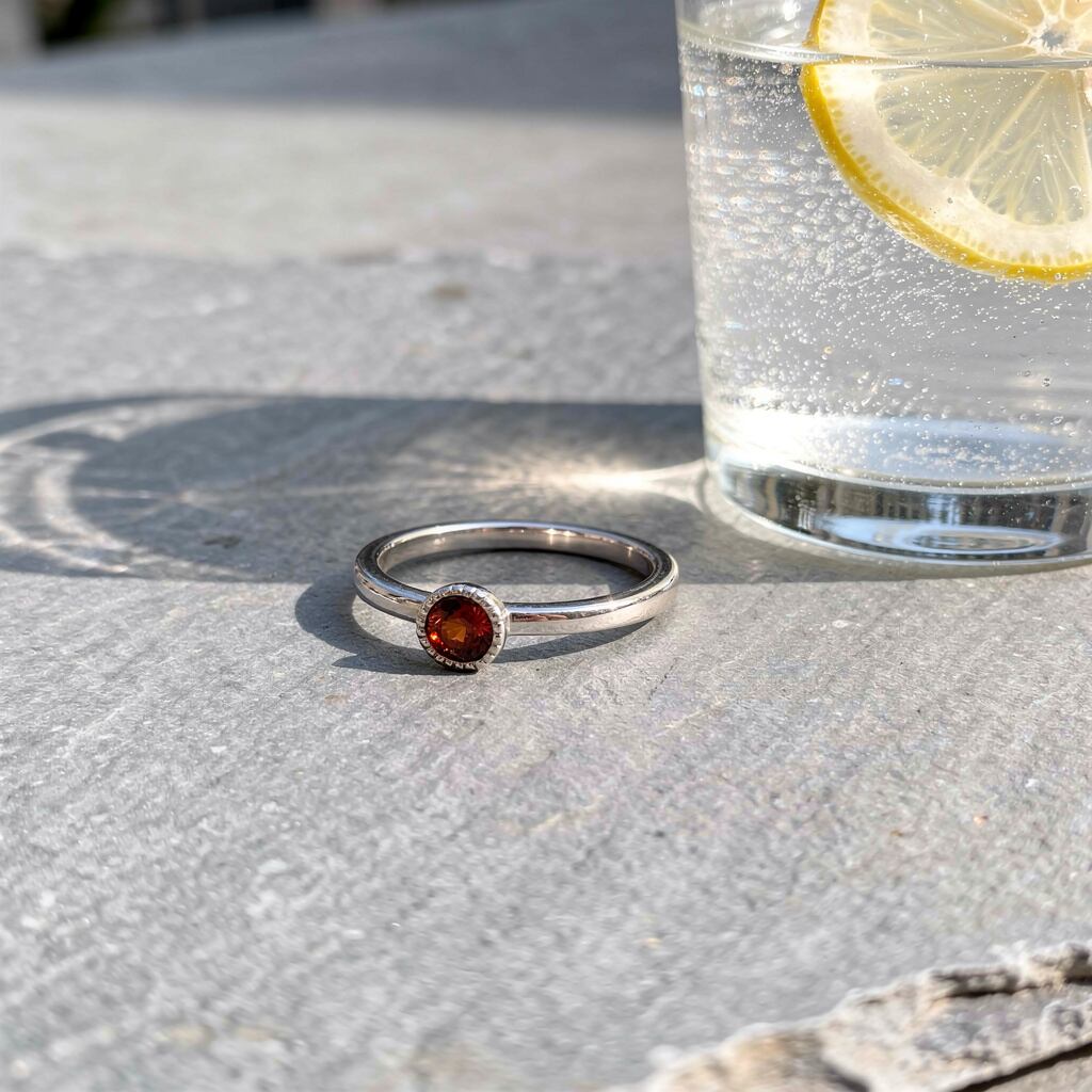 華奢なシルバーリングに、小さなガーネットが静かにきらめくデザインです。