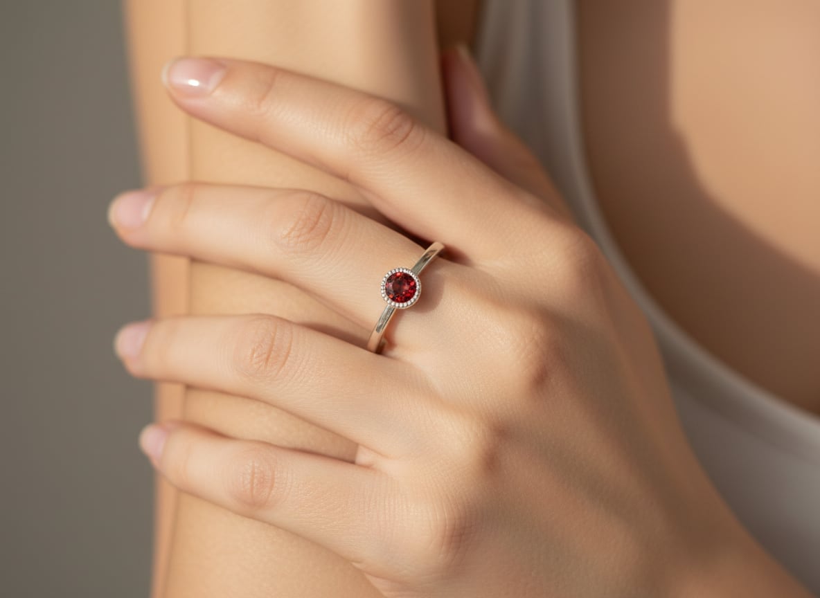 深いレッドのラウンドカットは、光を受けるたびに凛とした輝きを見せ、